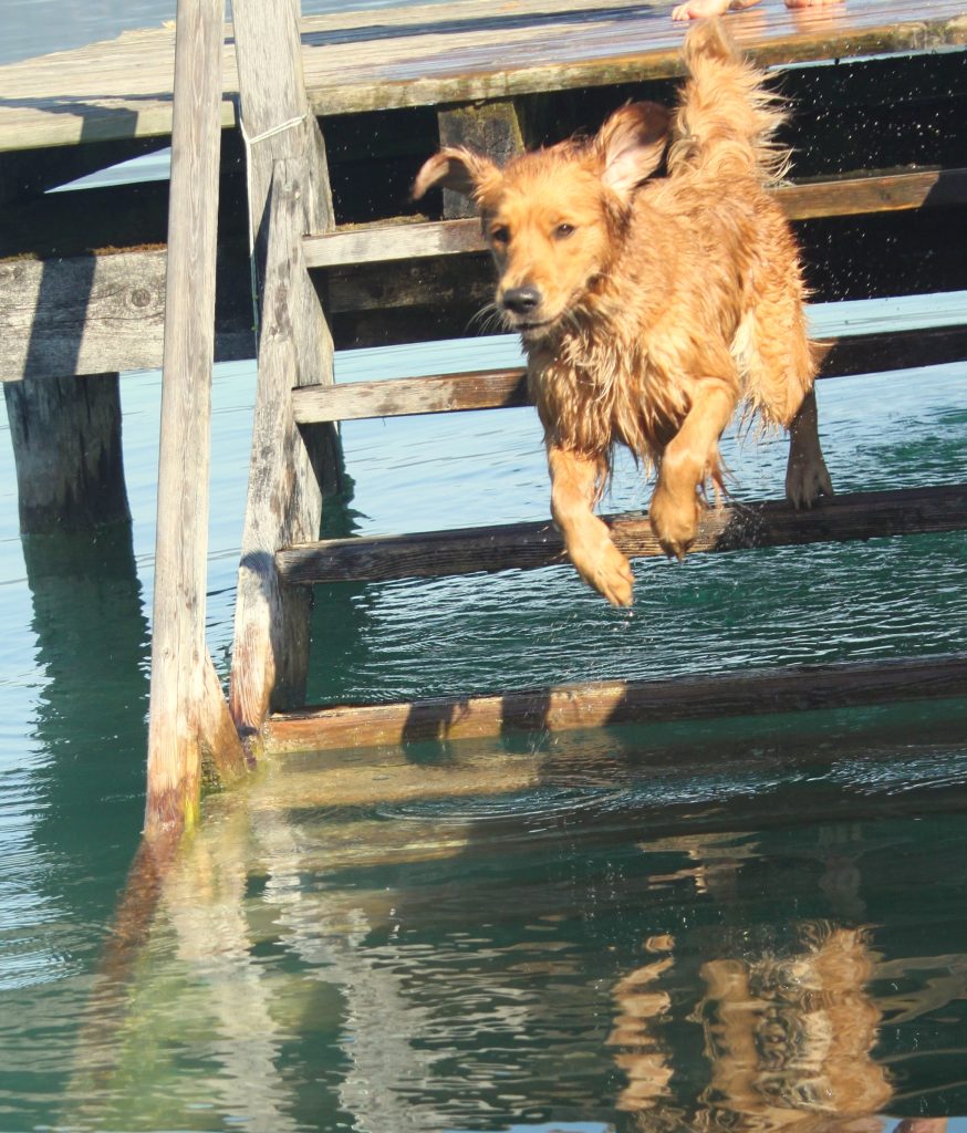 20.07.: Kandys erste Prüfung: Dummyprüfung mit der Startnummer 8. Erste Aufgabe: Wasserapport! 7 mal wird geschossen und man hört das Dummy ins Wasser platschen. Dann endlich ist man dran: Kandy weiß (eigentlich), dass sie erst loslegen darf, wenn sie geschickt wird. Der Schuss fällt (Kandy bleibt sitzen), das Dummy platscht ins Wasser (Kandy bleibt sitzen), die Richterin bewegt den Arm……….